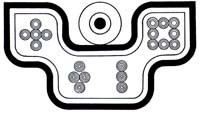 The Venus formula numbers were not always affixed to a circle. They were frequently housed in a nine-celled square. This square, an ancestral model for the famed "magic square of three" the Chinese called Lo Shu, provided the necessary foundation. for a Venus mask which fully expressed the original Venus formula. The three cells that housed the lesser portion numbers were replaced by three circles of the same dimension, yielding the mask's two eyes and mouth. The five cells that housed the greater portion numbers were replaced by five circles turned inside out by quarter sections, yielding five "tears" shaped like diamonds. The procedure outlined above should make clear to the reader the method by which the mask was originally created: