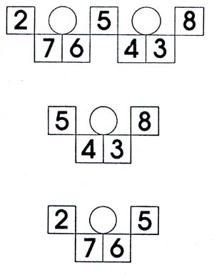 One of the most remarkable expressions of the Venus formula was a seven-celled "W" form in which the lesser portion numbers occupied the three upper cells and the greater portion numbers occupied the four lower cells. The numbers were arranged so as to achieve a balanced formula centered around the "begetter" number 5. Hence, the Morning Star numbers were 8, 3, 4, & 5; these yielded a four-celled "U" form adding to 20 (13 in the upper cells and 7 in the lower). The Evening Star numbers were 2, 7, 6, & 5; these yielded a four-celled "U" form adding to 20 (7 in the upper cells and 13 in the lower):